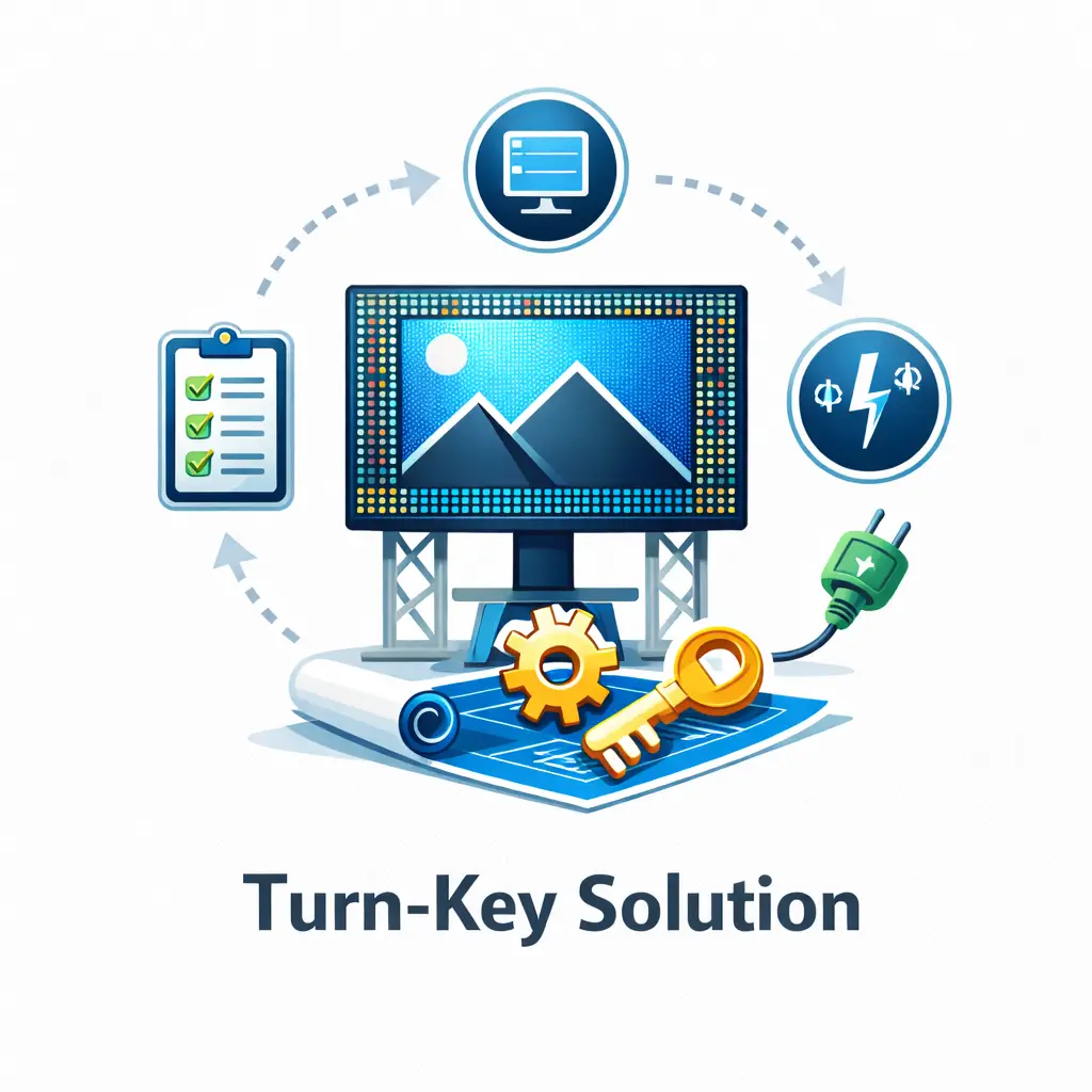 We also could provide complete turn-key LED display solutions, delivering everything needed for a successful project from start to finish. Our service includes structural design and fabrication, LED display supply, system integration, and professional installation